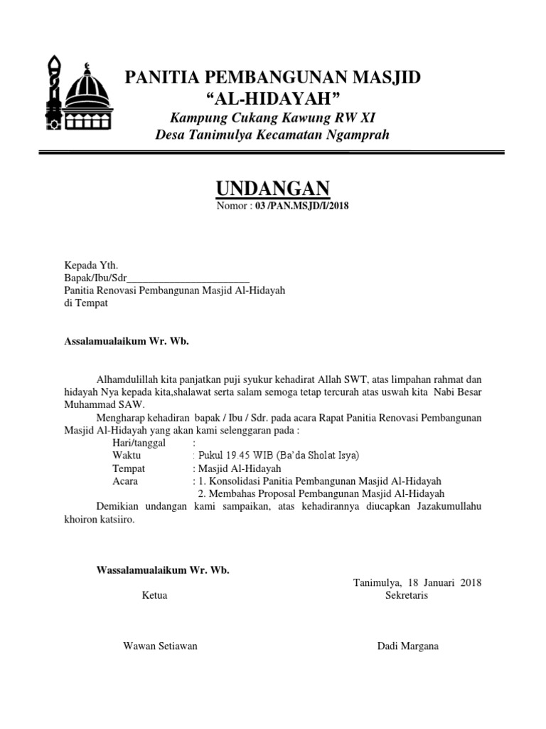 Untuk lebih jelasnya, berikut ini 7 contoh surat undangan yang bisa anda jadikan referensi. Rapat koordinasi pembangunan masjid baitul muttaqin hari : Dalam merencanakan rapat tentu tidak bisa dilakukan dengan sembaranggan. Apa yang dimaksud dengan surat undangan? Contoh surat undangan rapat pengertiannya terkini. Ada berbagai contoh surat undangan dengan berbagai jenis kegiatan seperti surat undangan rapat, pernikahan, reuni, dan sebagainya. Sedangkan contoh undangan irma (ikatan remaja masjid) dalam versi singkat padat dan praktis sebagai berikut berikut adalah tautan untuk melakukan download pengunduhan gratis contoh surat undangan remaja masjid yang dibuat dalam 2 versi yaitu berbentuk doc dan satunya lagi dalam. Demikian undangan ini kami sampaikan, atas perhatian dan kerja samanya kami ucapkan. Surat undangan rapat dkm 2012. Mohon maaf apabila banyak kesalahan dalam. Sebelum mengunduh file undangannya, sebaiknya kamu perlu tahu dulu kalaupun tidak menggunakan kop surat juga tidak masalah. Contoh surat undangan rapat pembubaran panitia kurban. Beberapa hal yang perlu disertakan dalam menulis surat undangan rapat agenda acara rapat tersebut adalah: